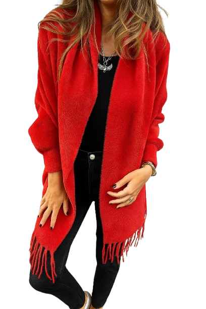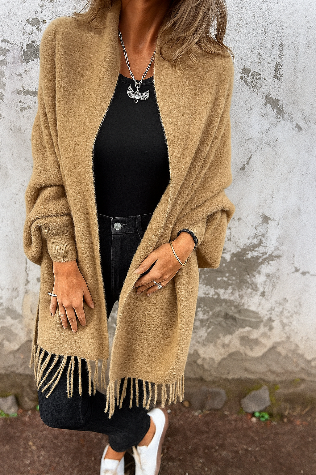 Alicia el Abrigo cálido con flecos elegantes con el que tendrás CALIDEZ Y ESTILO EN UNA SOLA PRENDA