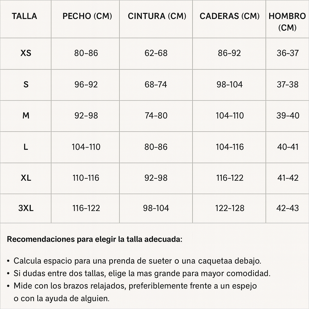 Talla | EU | Pecho | Cintura | Cadera | Hombros |