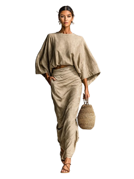 El conjunto Paula combina la elegancia natural del lino con la suavidad del algodón para crear una silueta fluida, fresca y femenina.